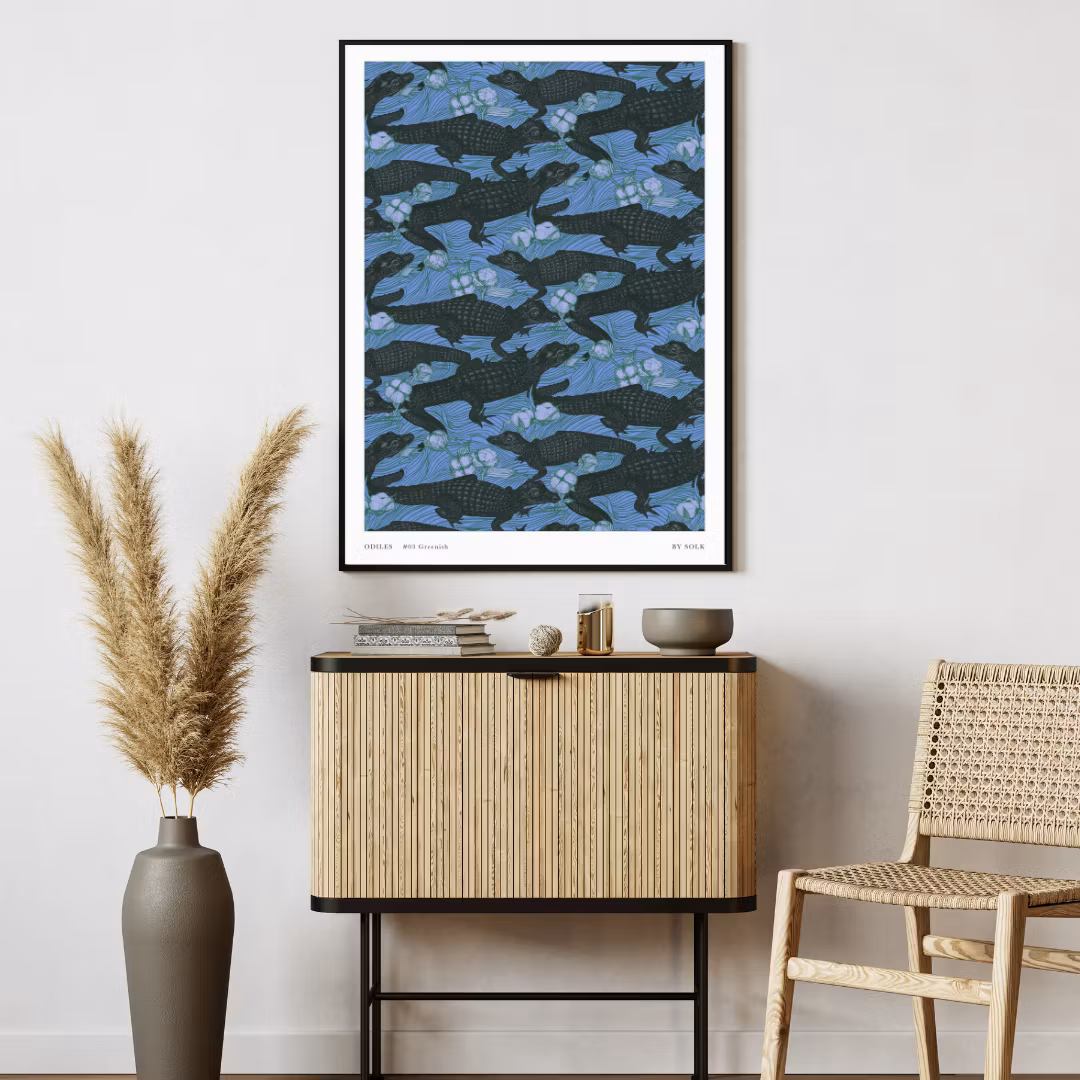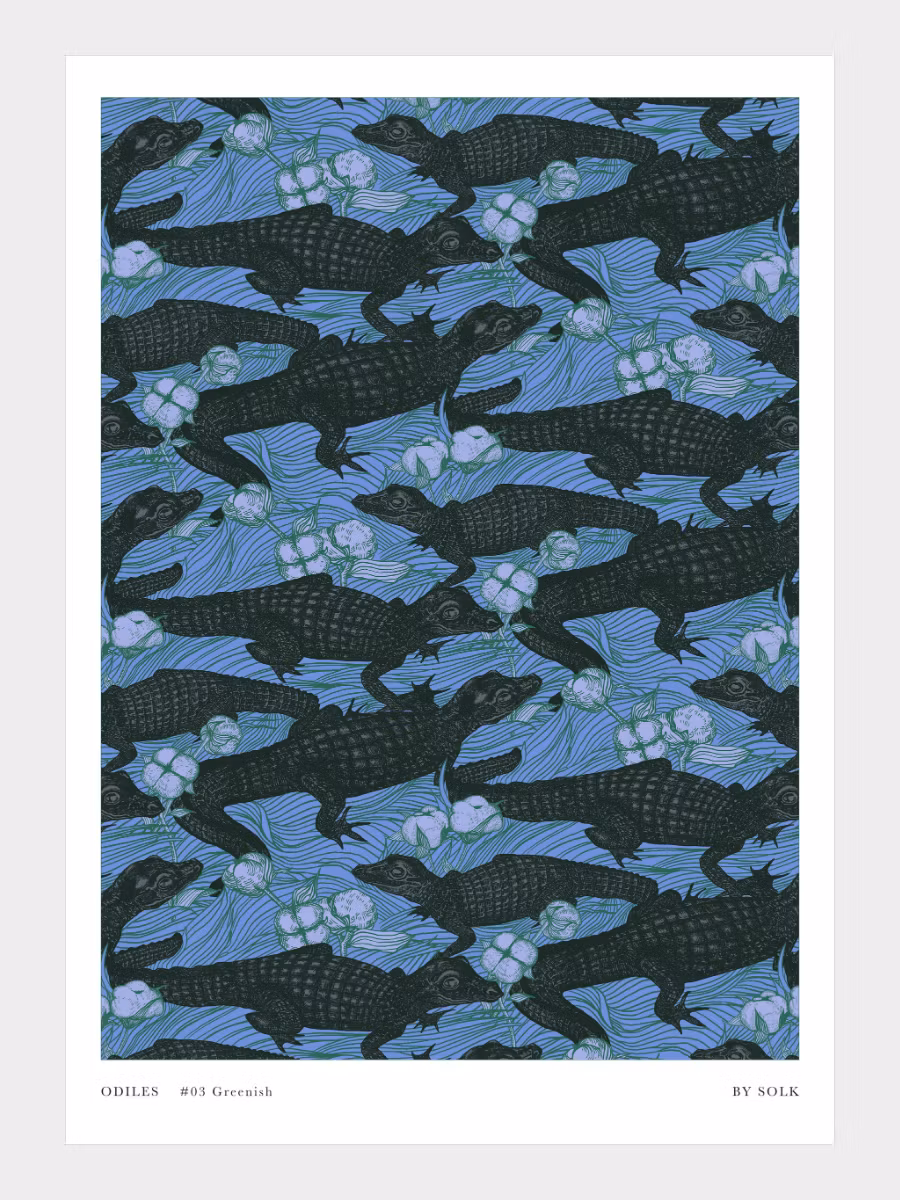 Odiles #03, high quality poster. Ugly and playful crocodile design in lavender hues.Matte finish, 50x70cm, 180g paper weight.