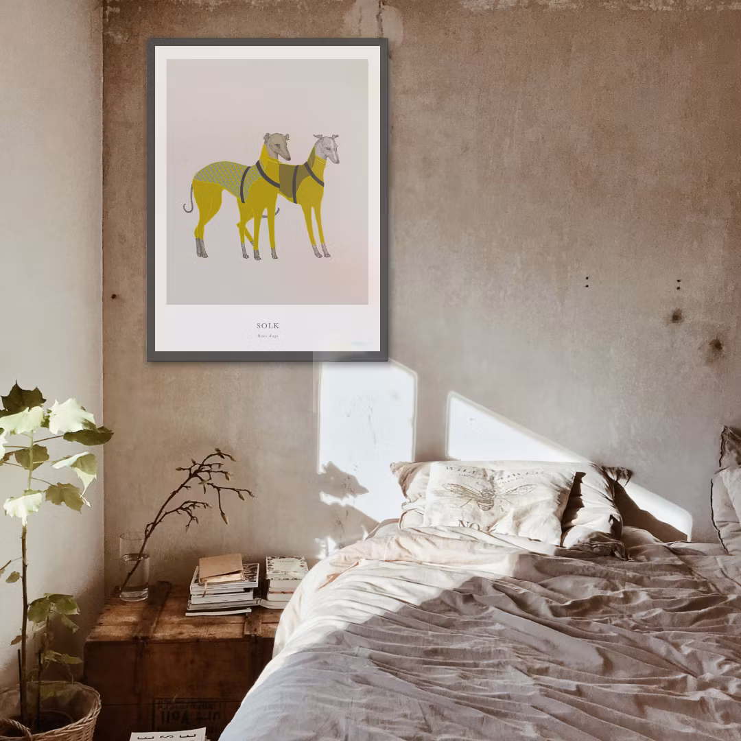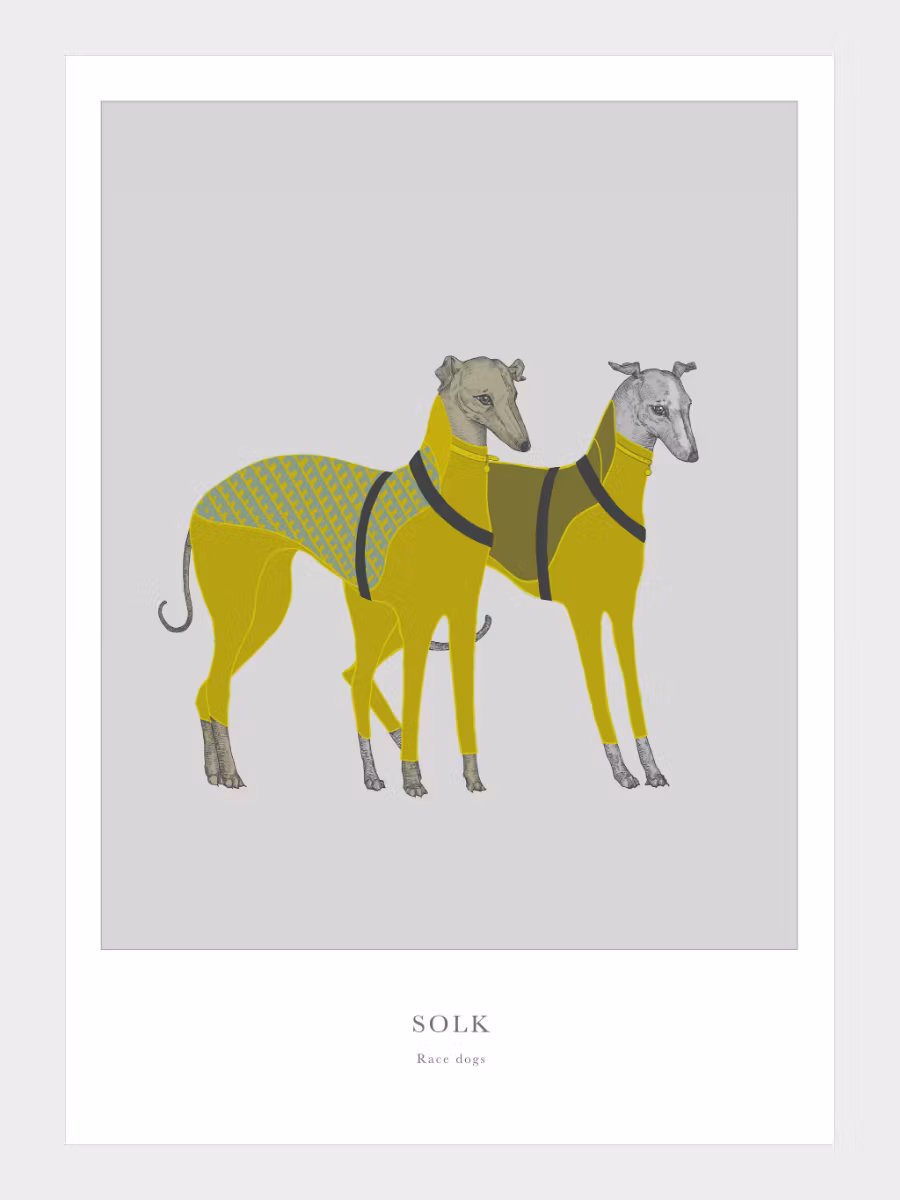 Our weird race dog duo Inky and Slinky ready for winter.Matte finish, 50x70cm, 180g paper weight.